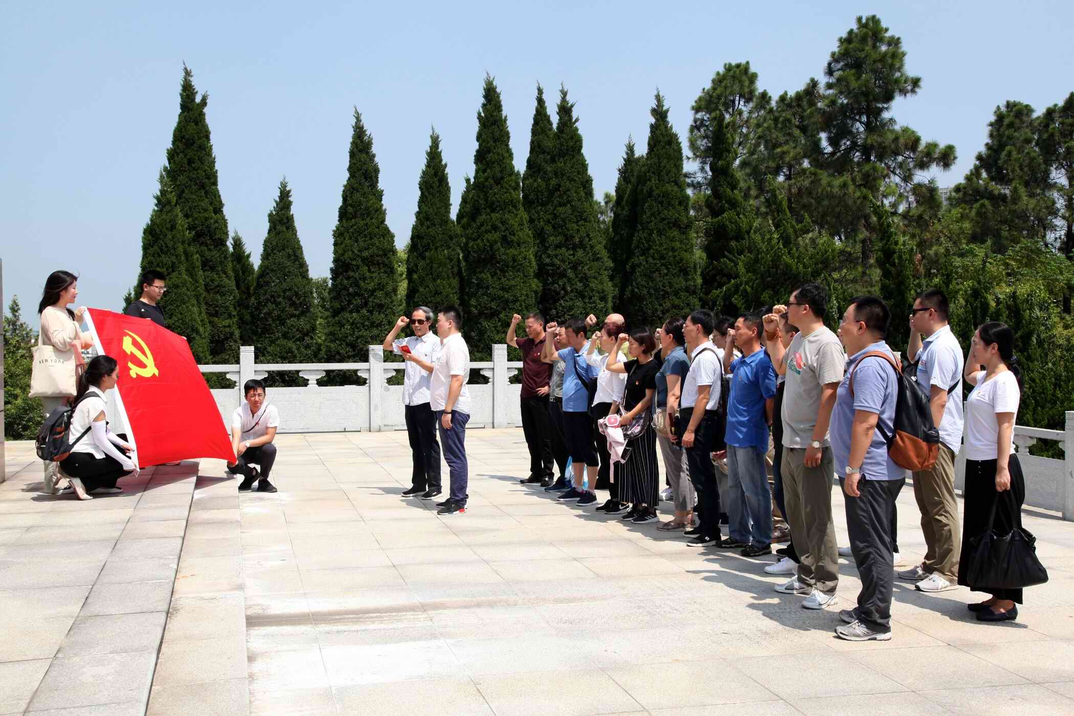 正午時分,大家揮汗如雨,馬不停蹄地來到巢湖南山烈士陵園。在高高的英雄紀念碑下,公司黨委為新入黨的預備黨員舉行了莊重的入黨宣誓,全體黨員重溫了入黨誓詞,繞場一周瞻仰了英雄紀念碑,緬懷革命先烈,接受革命精神洗禮。