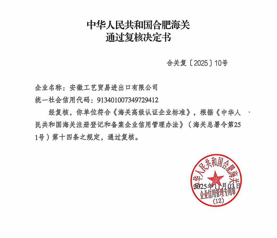 捷報再傳!近日,我司成功通過了中華人民共和國合肥海關的AEO高級認證復核!這是對我司在認證有效期內,持續恪守高級認證企業標準、堅持高標準管理再次權威肯定。這不僅標志著我們成功守住了海關信用管理的“最高星級”,更彰顯了公司管理體系與合規文化的持續性與穩定性。